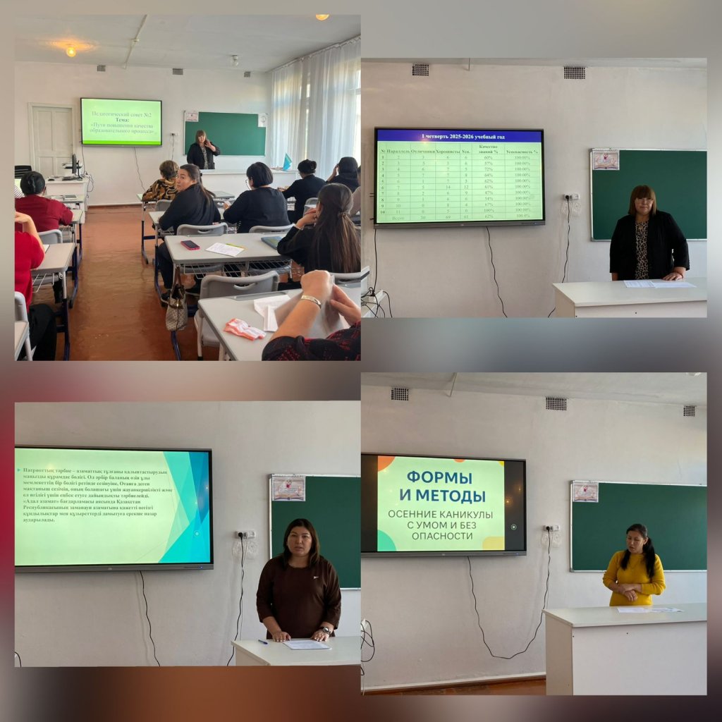 28 қазан күні № ЖББМ базасында «Білім беру үдерісінің сапасын арттыру жолдары» тақырыбында №2 педагогикалық кеңес өтті. Кеңесте білім беру сапасын жетілдіру, оқу-тәрбие үдерісін тиімді ұйымдастыру және оқушылардың дамуына қолайлы жағдай жасау бағытындағы өзекті мәселелер қарастырылды.