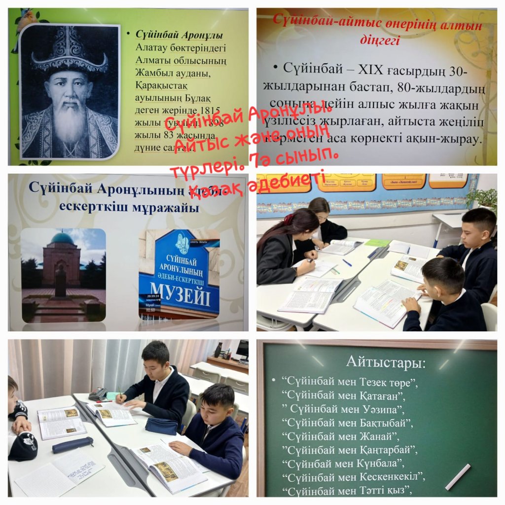 Қазақ тілі мен әдебиеті пәнінің апталығы аясында №6 жалпы орта білім беретін мектебінде 7-сынып оқушыларымен «Сүйінбай Аронұлы. Айтыс және оның түрлері» тақырыбында ашық сабақ өтті. Сабақтың мақсаты – оқушыларға айтыс өнерінің ерекшелігін танытып, Сүйінбай Аронұлының әдеби мұрасын терең меңгерту, сонымен қатар оқушыларды сөз қадірін түсінуге, тапқырлық пен шешендікке баулу болды.