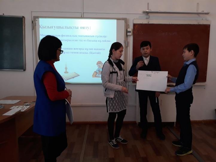 Ағымдағы жылдың 13 желтоқсан күні физика пәнінің мұғалімі Макишева М.К. 7 "ә" сыныбында "Деформация" тақырыбы бойынша ашық сабақ өткізді. Сабақ барысында жеке және топтық иапсырмаларды орындай отырып, оқушылар өзінің физика пәнініен өз білімдерін көрсете білді. Сабақта үштілдік элементері пайдаланылды. Психологиялық ахуалы балалардың белсенді жұмыс жасауға ықпалын тигізді.